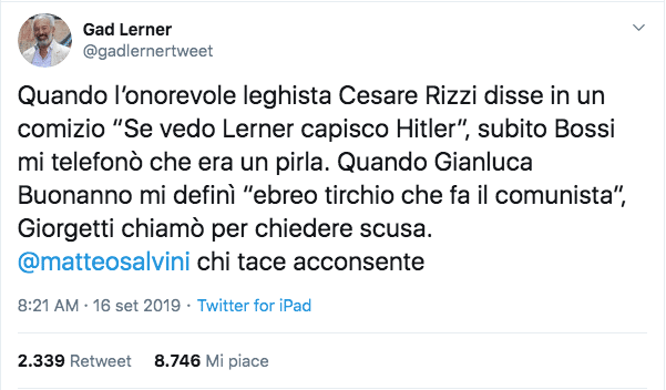 “Quando l’onorevole leghista Cesare Rizzi disse in un comizio “Se vedo Lerner capisco Hitler”, subito Bossi mi telefonò che era un pirla. Quando Gianluca Buonanno mi definì “ebreo tirchio che fa il comunista”, Giorgetti chiamò per chiedere scusa. Matteo Salvini, chi tace acconsente”, ha scritto su Twitter