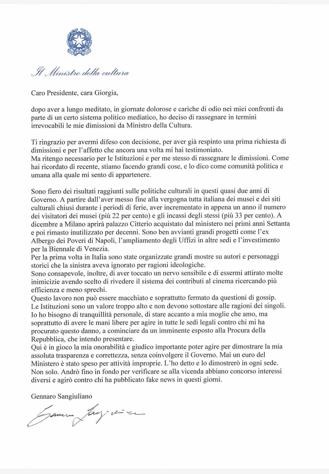 Sangiuliano ha inviato una lettera a Giorgia Meloni in cui ha presentato le sue “dimissioni irrevocabili”.