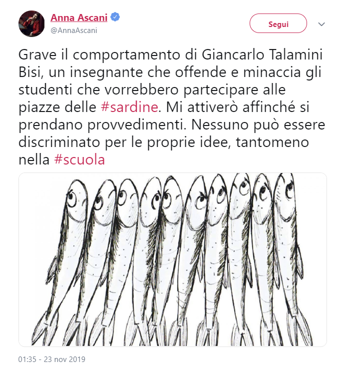 “Ci segnalano il caso di questo insegnante che avrebbe minacciato i suoi alunni di bocciatura in caso di partecipazione alle proteste delle sardine- ha continuato la sottosegretaria – Se l’episodio fosse confermato sarebbe gravissimo. Chiederemo un approfondimento. Intanto domando a Salvini: non era lui che diceva che i docenti non devono fare “politica” in classe? Cosa dice, oggi, davanti a questo caso?”, ha concluso Azzolina.