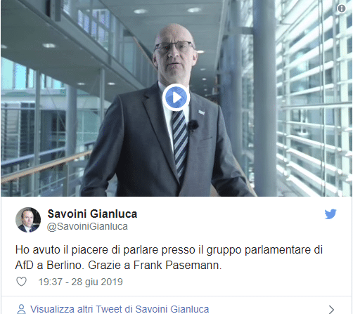 Il 28 giugno Savoini ha pubblicato un tweet dove racconta di aver partecipato ad una conferenza presso il gruppo parlamentare di AfD, il partito di estrema destra tedesca, con simpatie neonaziste, Alternative für deutschland. Nel video il deputato di AfD Frank Pasemann descrive Savoini come consulente politico per la Lega per quanto riguarda la Russia.