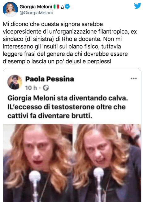 A denunciare l’accaduto è stata la stessa Meloni attraverso un tweet, dove ha riportato lo screenshoot di quanto pubblicato qualche giorno fa da Paola Pessina. L’ex prima cittadina del comune di Rho è anche una docente impegnata nella filantropia. Questo quanto scritto nei giorni scorsi contro la leader di Fratelli d’Italia: “Giorgia Meloni sta diventando calva. L’eccesso di testosterone oltre che cattivi fa diventare anche brutti”.