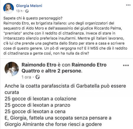 Tutto ha avuto inizio nella giornata di martedì 6 agosto quando Raimondo Etro, ex membro delle Brigate rosse che ha partecipato anche al sequestro di Aldo Moro in via Fani, ha insultato sul suo profilo Facebook Giorgia Meloni: “Anche la coatta parafascista di Garbatella può essere curata. 25 gocce di lexotan a colazione, 25 gocce di lexotan a pranzo, 25 gocce di lexotan a cena. E, Giorgia, fattela una sc***ta senza pensare a Giorgio Almirante che forse riesci a godere” ha scritto Etro.