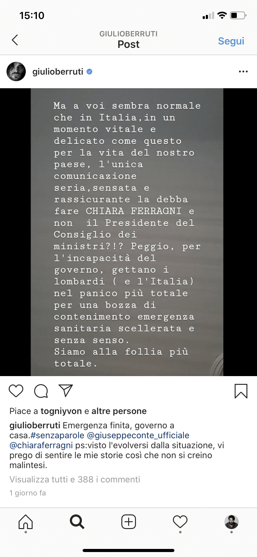 “Cerco sempre di non parlare di politica, nonostante sia poi di fatto una mia grande passione”. Sono le parole di Giulio Berruti, popolare attore televisivo italiano, che in questi giorni dal suo profilo Instagram lancia appelli al buonsenso, relativamente alla questione Coronavirus, assieme a strali più o meno espliciti al governo. Pubblica storie con articoli fortemente critici con il premier Giuseppe Conte, di quelli che lo chiamano “Giuseppi” e che si concludono con “aridatece Bertolaso!”. Pubblica post duri contro la linea malferma tenuta dall’esecutivo, in particolare in relazione alla fuga di notizie sul decreto di restrizione della Lombardia, sottolineando, pur con qualche punto esclamativo e interrogativo di troppo, che sta facendo più Chiara Ferragni (con la sua raccolta fondi per il San Raffaele) del Presidente del Consiglio. La foto ha una didascalia ermetica: “Emergenza finita, governo a casa”.