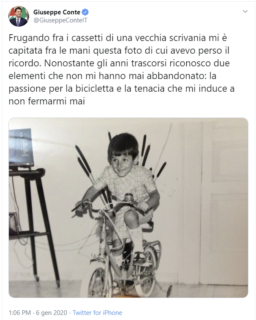 Nel giorno dell’Epifania il premier Giuseppe Conte ha stupito i suoi followers pubblicando su Twitter una foto molto personale, perché risalente alla sua infanzia. Il presidente del Consiglio, in genere molto riservato, ha pubblicato un’immagine che lo ritrae da bambino in sella a una bicicletta.