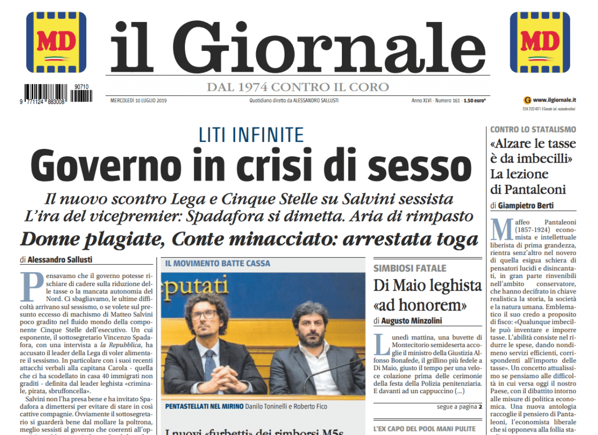 Governo crisi di sesso | Il Giornale fa una scelta editoriale che – come sempre – fa discutere. Il quotidiano diretto da Alessandro Sallusti decide di aprire l’edizione del 10 luglio 2019 con lo scontro Salvini-Spadafora, e lo fa con un titolo ironico e pungente: “Governo in crisi di sesso”.