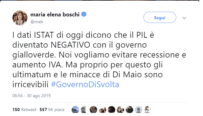 “I dati Istat di oggi dicono che il Pil è diventato negativo con il governo gialloverde. Noi vogliamo evitare recessione e aumento Iva. Ma proprio per questo gli ultimatum e le minacce di Di Maio sono irricevibili”, ha scritto su Twitter Maria Elena Boschi.