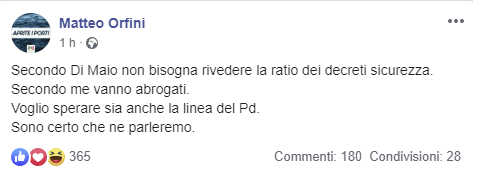 A queste parole replica Orfini: “Visto che dal M5s si dicono stupiti per le reazioni alle parole di Luigi Di Maio, la spiego più semplice: un governo che difende la ratio del dl sicurezza è un governo al quale vota la fiducia Matteo Salvini. Non il Pd. Discontinuità sui temi significa questo”.