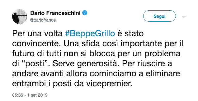 ore 14.40 – Dario Franceschini: “Grillo ha ragione, via i vicepremier” – “Per una volta Beppe Grillo è stato convincente. Una sfida così importante per il futuro di tutti non si blocca per un problema di “posti”. Serve generosità. Per riuscire a andare avanti allora cominciamo a eliminare entrambi i posti da vicepremier”: lo scrive l’esponente del Pd Dario Franceschini su Twitter.