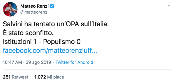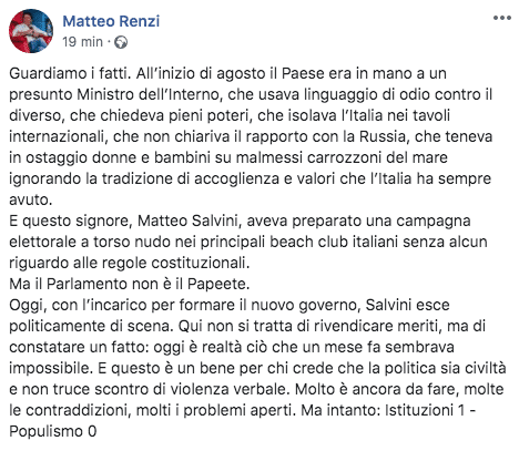 ore 9,20 – Crisi Governo news, Renzi: “Salvini esce di scena” – “Oggi, con l’incarico per formare il nuovo governo, Salvini esce politicamente di scena. Qui non si tratta di rivendicare meriti, ma di constatare un fatto: oggi è realtà ciò che un mese fa sembrava impossibile. E questo è un bene per chi crede che la politica sia civiltà e non truce scontro di violenza verbale. Molto è ancora da fare, molte le contraddizioni, molti i problemi aperti. Ma intanto: Istituzioni 1 – Populismo 0”. Lo scrive su Facebook Matteo Renzi.