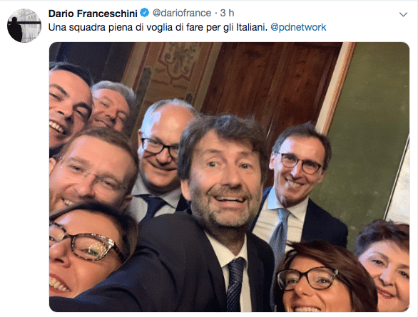 ore 12,00 – Franceschini: “Squadra piena di voglia di fare” – Dario Franceschini, neo ministro dei Beni Culturali, ha postato una foto sul suo profilo Twitter in cui sono ritratti tutti i ministri esponenti del Partito Democratico con la seguente didascalia: “Una squadra piena di voglia di fare per gli Italiani”.