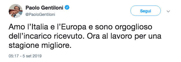 ore 14,20 – Gentiloni: “Orogoglioso dell’incarico” – “Amo l’Italia e l’Europa e sono orgoglioso dell’incarico ricevuto. Ora al lavoro per una stagione migliore”: lo scrive Paolo Gentiloni, candidato italiano alla Commissione Ue, sul suo profilo Twitter.