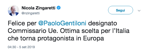 ore 13,30 – Zingaretti: “Con Gentiloni Italia torna protagonista” – “Felice per Paolo Gentiloni designato Commissario Ue. Ottima scelta per l’Italia che torna protagonista in Europa”: lo scrive il segretario del Partito Democratico Nicola Zingaretti sul suo profilo Twitter.