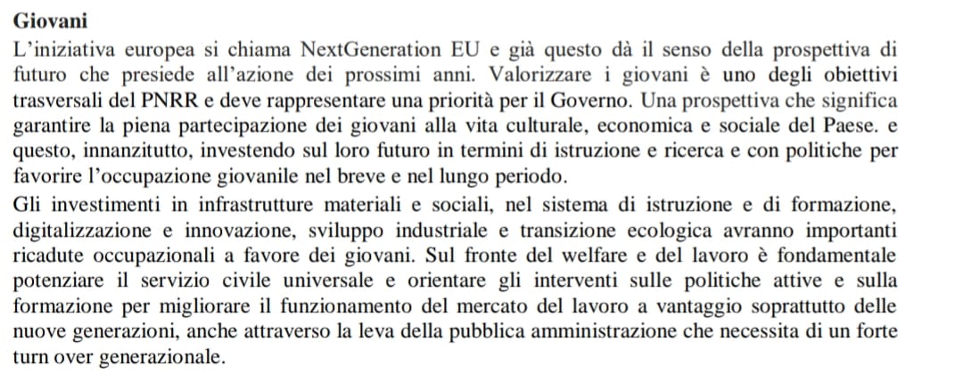 Piena partecipazione dei giovani alla vita culturale del Paese, investimenti in istruzione e ricerca con politiche per favorire l’occupazione nel breve e nel lungo periodo, digitalizzazione, sviluppo industriale, transizione ecologica che avranno “ricadute occupazionali a favore dei giovani”, questi alcuni dei punti contenuti nel documento programmatico del Pd, che però risultano ancora troppo vaghi. Per i giovani di Inoltre infatti quelli enunciati nel testo sembrano solo dei buoni propositi, ma il programma non si occupa di sviluppare la parte politica, che spieghi come s’intende raggiungere quegli obiettivi.