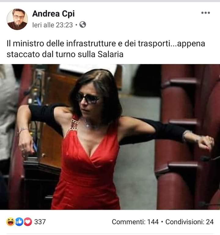 La neo-ministra delle Infrastrutture e dei Trasporti Paola De Micheli, ha ricevuto pesanti insulti da un militante di CasaPound che dal suo profilo Facebook commenta così una foto che la ritrae in aula: “Il ministro delle Infrastrutture e dei trasporti…appena staccato dal turno sulla Salaria”. Il riferimento è alla strada statale di Via Salaria che collega Roma al mare Adriatico, lungo la quale spesso stazionano molte prostitute in attesa dei clienti.