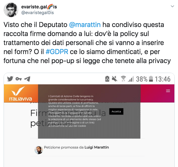 Una petizione come tante altre, penseranno molti. E invece no, quella di Marattin ha una grande e grottesca particolarità, che fa prendere una piega tragicomica al dibattito: come scoperto da Evariste Gal0is, celebre hacker che scoprì le numerose falle della piattaforma Rousseau del Movimento 5 Stelle, il sito di Italia Viva che ospita la petizione di Marattin non rispetta la normativa Gdpr sul trattamento dei dati personali.