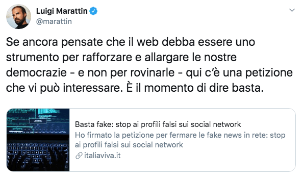 Non pago della figuraccia, Marattin ha deciso di proporre una petizione online sul sito di Italia Viva: “Sono già diversi, infatti, i casi comprovati di consultazioni elettorali (in primis il referendum sulla Brexit del giugno 2016, ma non solo) che sono risultate profondamente distorte e manipolate dalla diffusione di informazioni false sulla rete”, si legge nel testo della petizione.