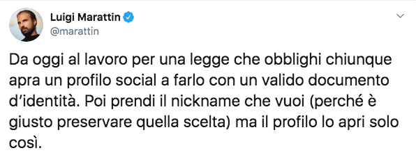 Prendendo spunto da un’idea del regista Gabriele Muccino, Marattin ha twittato: “Da oggi al lavoro per una legge che obblighi chiunque apra un profilo social a farlo con un valido documento d’identità. Poi prendi il nickname che vuoi (perché è giusto preservare quella scelta) ma il profilo lo apri solo così”.
