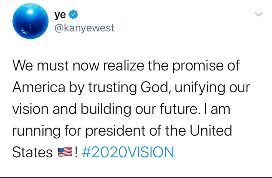 Il rapper Kanye West ha annunciato di voler diventare Presidente degli Stati Uniti d’America. Lo aveva già anticipato durante un evento a New York, ma pare che adesso sia ufficiale. Non è ben chiaro se il rapper abbia intenzione di partecipare alla campagna del 2024 o quella del 2020, ma l’hashtag aggiunto sul post social (#2020vision) potrebbe essere la risposta. “Ora dobbiamo realizzare la promessa dell’America credendo in Dio, unificando la nostra visione e costruendo il nostro futuro. Sono in corsa per la presidenza degli Stati Uniti”, ha scritto West sui social. L’annuncio è arrivato a quattro mesi dalle prossime elezioni, nel giorno in cui negli Stati Uniti si festeggia l’Independence Day (4 luglio), ma la sua candidatura non è ben vista e ha già scatenato qualche polemica.
