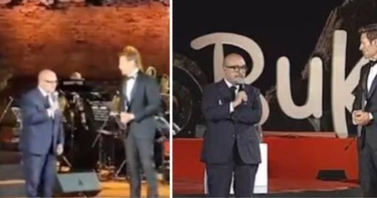 “Applaudite che qua non si possono coprire i fischi, siamo in diretta”, ha detto ironicamente la comica-presentatrice rivolta al pubblico. Un chiaro riferimento a quanto accaduto con il Taormina Book Festival.