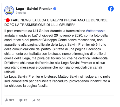 Il partito di Matteo Salvini, sempre su Twitter, ha risposto all’accusa: “Il post mostrato da Lilli Gruber durante la trasmissione Otto e Mezzo andata in onda su La7 di giovedì 26 novembre 2020, con la foto della conduttrice e del premier Giuseppe Conte senza mascherina, non appartiene alla pagina ufficiale della Lega Salvini Premier né è frutto della comunicazione del partito”