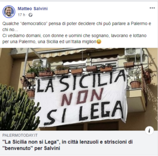 “Qualche “democratico” pensa di poter decidere chi può parlare a Palermo e chi no”, ha scritto ieri Salvini sulla sua pagina Facebook, condividendo la notizia delle contestazioni. “Ci vediamo domani, con donne e uomini che sognano, lavorano e lottano per una Palermo, una Sicilia ed un’Italia migliori”. Stamattina il leader della Lega ha postato inoltre una foto che lo ritrae con indosso la coppola siciliana, mentre beve un caffé, dove si legge la scritta: “Se voi ci siete io non mollo”.