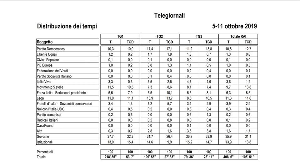 “Nella settimana che ha preceduto la Leopolda, 5-11 ottobre, dati Osservatorio di Pavia, i Tg Rai hanno cancellato Italia Viva, in particolare il Tg di Rai1: 0.3 per cento degli spazi di parola al Tg1, 1.6 per cento al Tg3, 2.5 per cento al Tg2. Ieri sera proprio il Tg1 delle 20 ha dedicato alla giornata di apertura della manifestazione una manciata di secondi, meno di 15 in totale”.