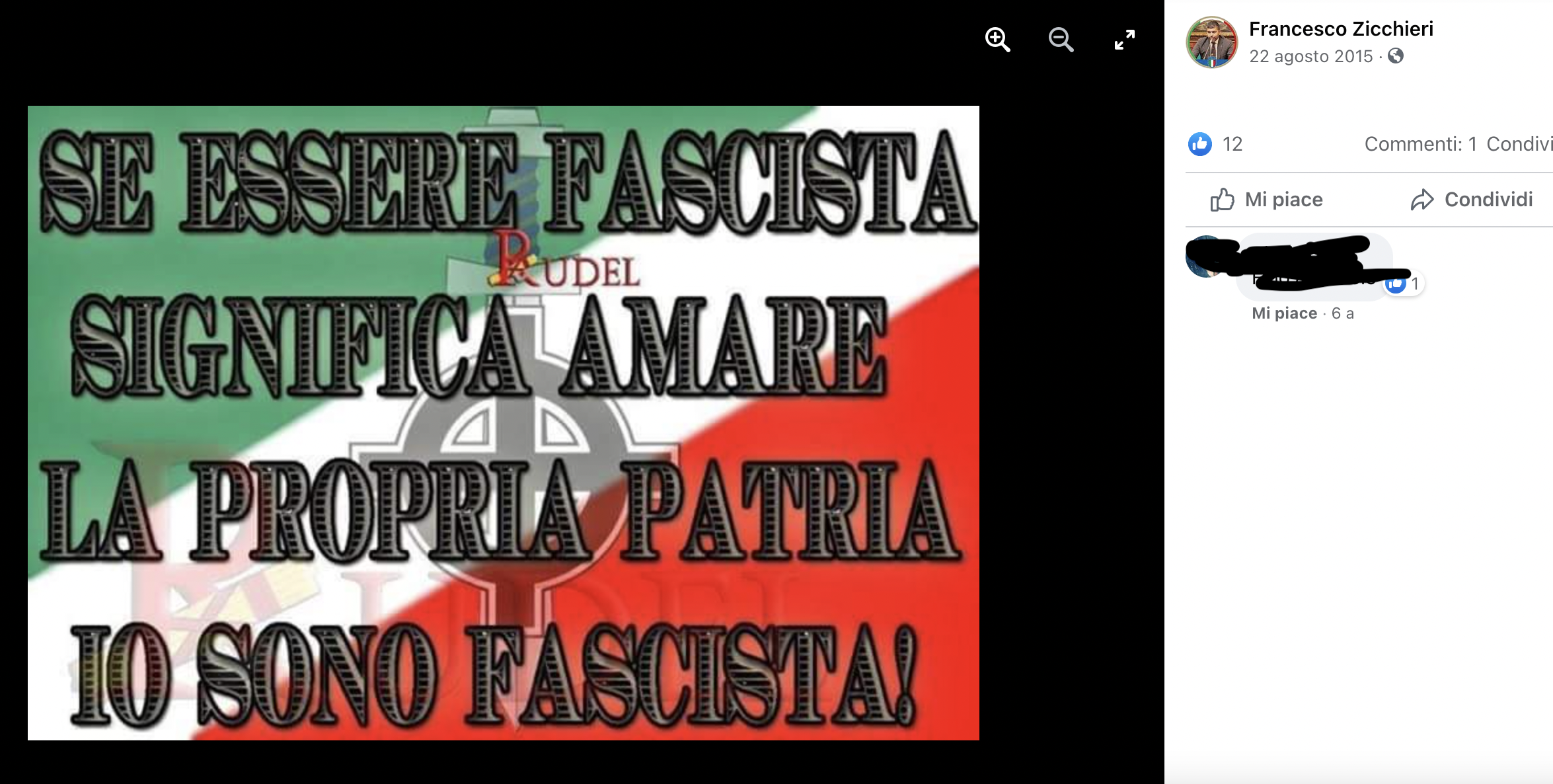 “Se essere fascista significa amare la propria patria io sono fascista”: è un post, pubblicato sui social e tuttora presente su Facebook, postato nel 2015 da Francesco Zicchieri, deputato della Lega, ex coordinatore del Carroccio nel Lazio, sostituito poi da Claudio Durigon, e Responsabile federale della gestione e ampliamento delle sedi territoriali della Lega nel centro-sud.