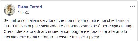 Concetto in qualche modo nuovamente espresso su Facebook attraverso un post alquanto polemico in cui la Fattori ha criticato il voto di oggi sulla piattaforma Rousseau con le seguenti parole: “Sei milioni di italiani decidono che non ci votano più e noi chiediamo a 100.000 italiani (che sicuramente ci hanno votati) se è per colpa di Luigi. Credo che sia ora di archiviare le campagne elettorali che alterano la lucidità delle menti e tornare a essere utili per il paese”.