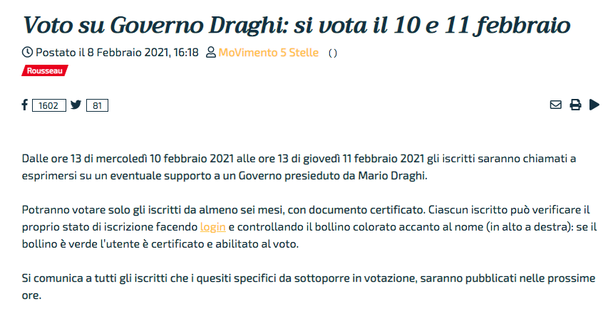 Leggi anche: 1. Crisi di governo, ultime news. Oggi Draghi incontra i grandi partiti 2. La moltiplicazione dei pani, dei pesci e dei titoli derivati: Mario Draghi santo subito (di Alessandro Di Battista) 3. Il progetto di Beppe Grillo: un partito nuovo guidato da Giuseppe Conte