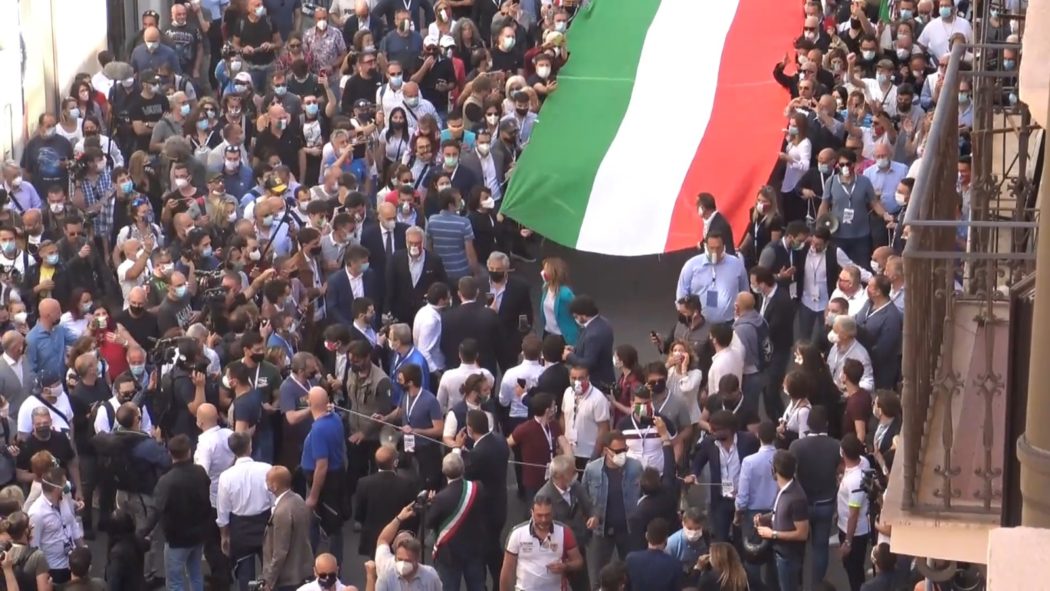Centrodestra in piazza, assembramenti e niente mascherine per il corteo di Salvini e Meloni