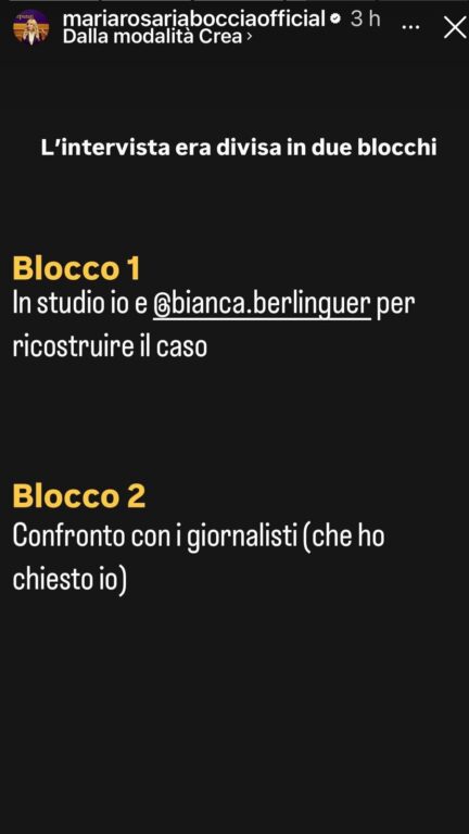 “Non abbiamo mai discusso del secondo blocco e del tipo di domande che avrebbero fatto. Il primo blocco era dedicato ripeto unicamente a definire i contorni chiari della vicenda. Avevo chiesto la formula dei due blocchi perché sarei entrata nel secondo solo con una base di verità solida, che avrebbe permesso di cercare la verità autentica, evitando il gossip e qualsiasi possibile strumentalizzazione politica”.