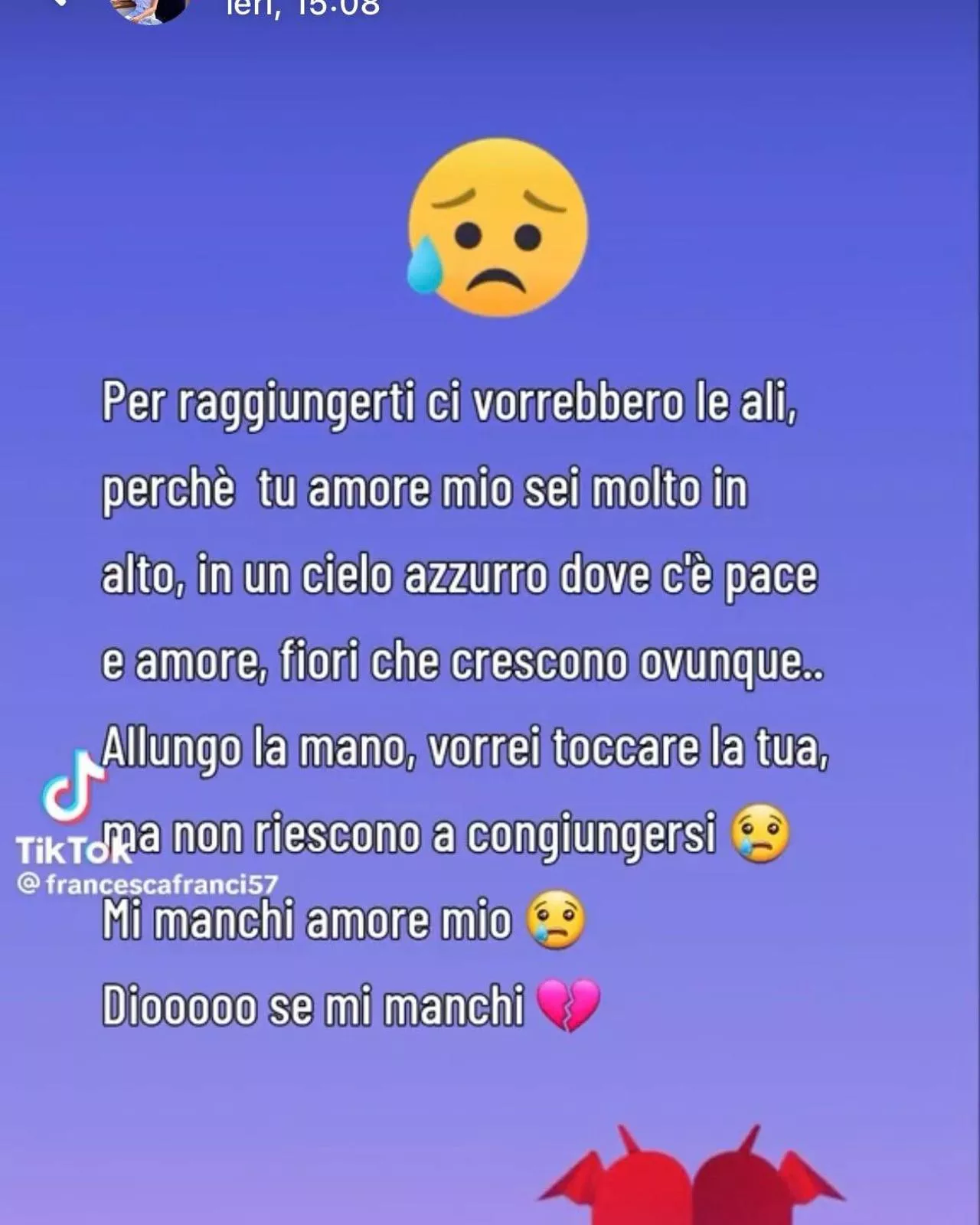 Il messaggio, scritto su uno sfondo viola e condito da cuori spezzati e smiles tristi. è stato messo su TikTok dall’utente Francescafranci57.