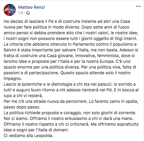 Ora è ufficiale: Matteo Renzi lascia il Pd. La notizia, ormai nell’aria da giorni, era stata anticipata dalla telefonata che l’ex segretario dem ha fatto nella serata di ieri, lunedì 16 settembre, al premier Giuseppe Conte per informarlo della sua decisione di lasciare il partito e ribadirgli lealtà nei confronti del governo.
