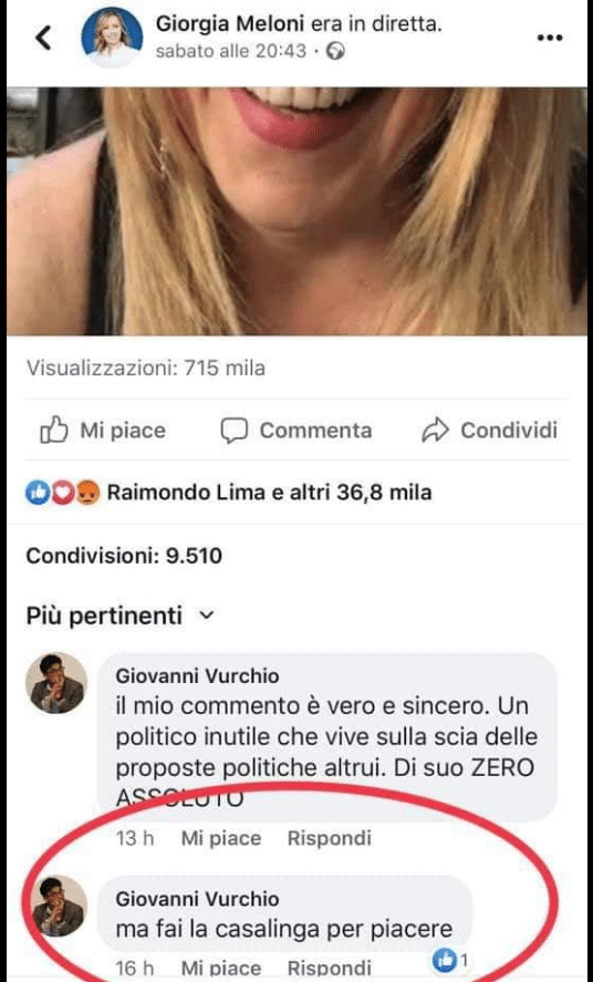 “Il signore che commenta così una mia diretta è il segretario cittadino e consigliere comunale del Pd ad Andria”, ha scritto sui social la leader di FdI. “Ecco a voi il famoso rispetto delle donne della sinistra, che poi usano ‘casalinga’ come se fosse un’offesa. Ma quanto sono tristi e ipocriti?”.