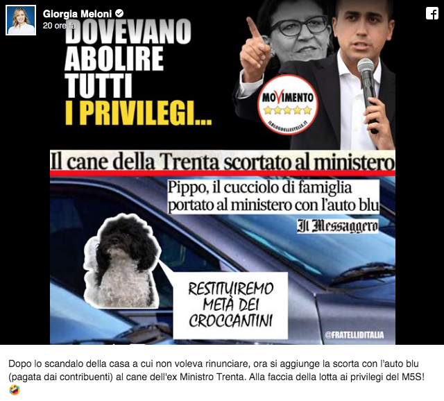 Nell’immagine del post campeggia la figura di Luigi Di Maio, con l’ex ministra Trenta sullo sfondo e il cagnolino in primo piano che afferma: “Restituiremo metà dei croccantini”.