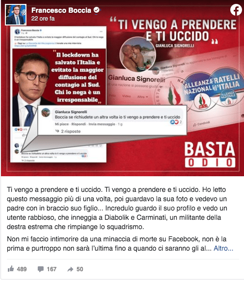 “Non mi faccio intimorire da una minaccia di morte su Facebook, non è la prima e purtroppo non sarà l’ultima fino a quando ci saranno gli alimentatori di odio; ho provveduto come sempre a segnalarlo alle autorità competenti – spiega Boccia nel post – Noi andiamo avanti, a testa alta, tutelando sempre e soltanto la sicurezza sanitaria e i diritti di tutti, a partire dal diritto alla salute che non può essere calpestato dai negazionisti e dagli squilibrati che non ci fanno paura #bastaodio”.