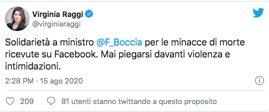 Diversi i messaggi di solidarietà ricevuti dal ministro dem. Fra questi anche quello della sindaca di Roma Virginia Raggi: “Solidarietà a ministro Boccia per le minacce di morte ricevute su Facebook. Mai piegarsi davanti violenza e intimidazioni”.