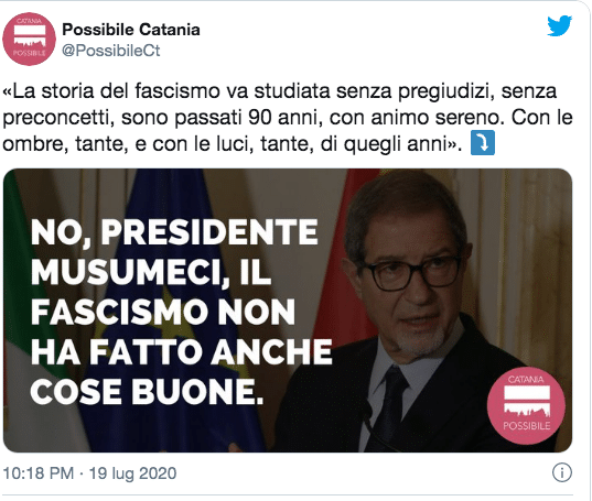 Le prime critiche alle dichiarazioni del “governatore” siciliano sono arrivate dalla sezione catanese di Possibile: “Con queste parole vergognose il presidente della regione Sicilia Nello Musumeci, durante una visita a Mascali, ha elogiato le opere infrastrutturali del regime che a suo dire avrebbero innescato un processo di “modernizzazione” del Mezzogiorno. Attraverso l’ennesimo tentativo di revisionismo del periodo più buio e tragico della nostra storia recente, Musumeci dimostra di non aver mai rinnegato i suoi trascorsi politici tra le file del Movimento Sociale Italiano”, ha scritto lo staff del movimento su Twitter.