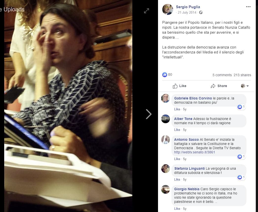 “La nostra portavoce in Senato Nunzia Catalfo sa benissimo quello che sta per avvenire, e si dispera…. La distruzione della democrazia avanza con l’accondiscendenza dei media ed il silenzio degli ‘intellettuali'”, scriveva su Facebook il collega Sergio Puglia.