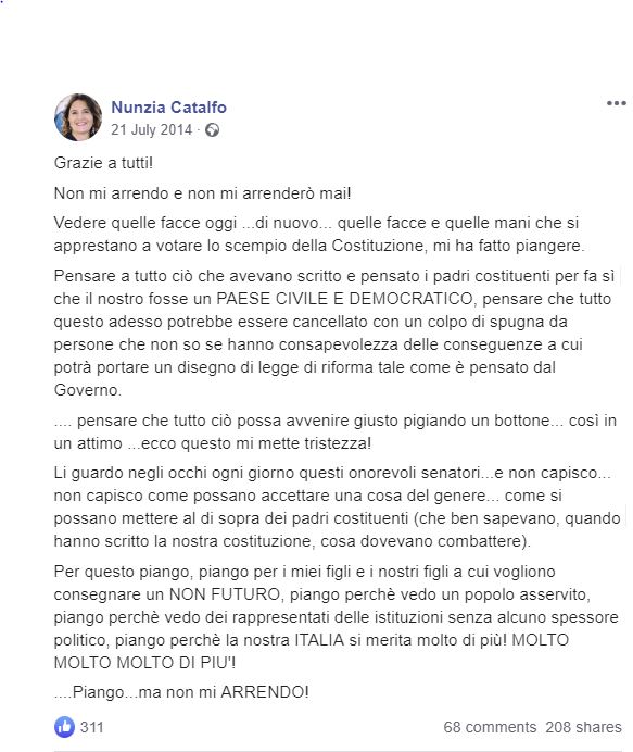 “Vedere quelle facce oggi …di nuovo… quelle facce e quelle mani che si apprestano a votare lo scempio della Costituzione, mi ha fatto piangere.Pensare a tutto ciò che avevano scritto e pensato i padri costituenti per fa sì che il nostro fosse un PAESE CIVILE E DEMOCRATICO, pensare che tutto questo adesso potrebbe essere cancellato con un colpo di spugna da persone che non so se hanno consapevolezza delle conseguenze a cui potrà portare un disegno di legge di riforma tale come è pensato dal Governo”, si legge nel post Facebook di luglio 2014.