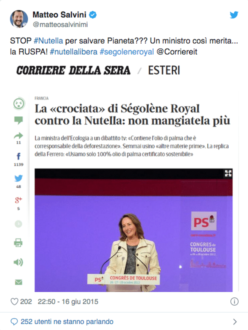 In un tweet, Salvini scriveva: “STOP #Nutella per salvare Pianeta??? Un ministro così merita… la RUSPA! #nutellalibera #segoleneroyal”.