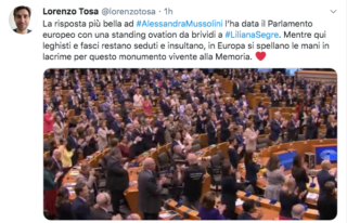 “La risposta più bella ad AlessandraMussolini l’ha data il Parlamento europeo con una standing ovation da brividi a LilianaSegre”, scrive Lorenzo Tosa. “Mentre qui leghisti e fasci restano seduti e insultano, in Europa si spellano le mani in lacrime per questo monumento vivente alla Memoria”.
