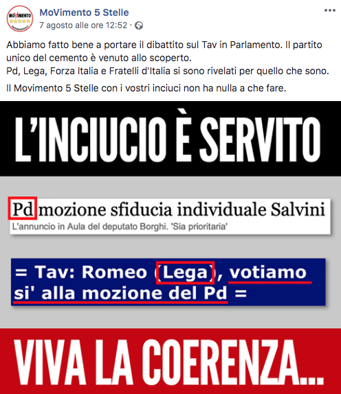 Nello stesso giorno in cui si spezzava l’alleanza del M5s con la Lega, sulle mozioni Tav in Senato, il Movimento si scagliava anche contro il Pd, per lo stesso motivo: aver votato a favore della tav. “Abbiamo fatto bene a portare il dibattito sul Tav in Parlamento. Il partito unico del cemento è venuto allo scoperto. Pd, Lega, Forza Italia e Fratelli d’Italia si sono rivelati per quello che sono. Il Movimento 5 Stelle con i vostri inciuci non ha nulla a che fare”.