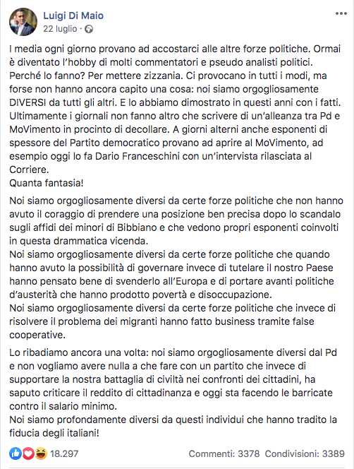 “Ultimamente i giornali non fanno altro che scrivere di un’alleanza tra Pd e MoVimento in procinto di decollare. A giorni alterni anche esponenti di spessore del Partito democratico provano ad aprire al MoVimento, ad esempio oggi lo fa Dario Franceschini con un’intervista rilasciata al Corriere. Quanta fantasia!”, scrive di Maio, che subito dopo fa riferimento a Bibbiano: “Noi siamo orgogliosamente diversi da certe forze politiche che non hanno avuto il coraggio di prendere una posizione ben precisa dopo lo scandalo sugli affidi dei minori di Bibbiano e che vedono propri esponenti coinvolti in questa drammatica vicenda”.
