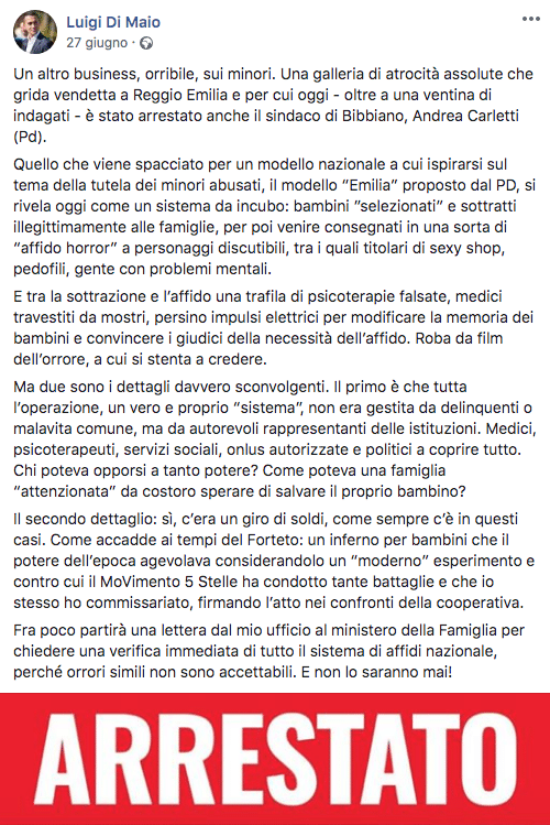 Luigi Di Maio: Modello “Emilia del Pd” è un sistema da incubo, fanno business di minori, arrestato il sindaco Carletti” – 27 giugno 2019