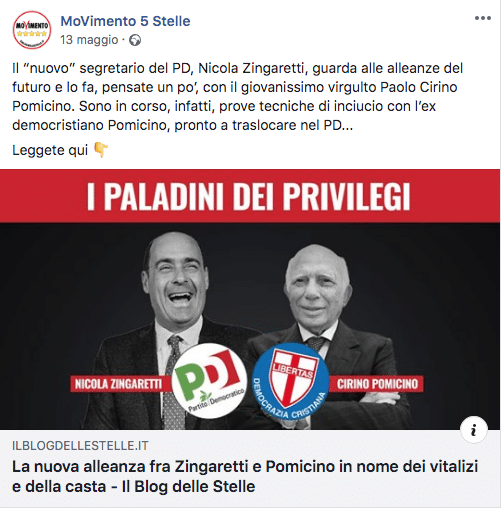 Non solo Renzi, il M5s si scaglia duramente anche contro il nuovo segretario del Pd, Nicola Zingaretti e scrive: “Il “nuovo” segretario del PD, Nicola Zingaretti, guarda alle alleanze del futuro e lo fa, pensate un po’, con il giovanissimo virgulto Paolo Cirino Pomicino. Sono in corso, infatti, prove tecniche di inciucio con l’ex democristiano Pomicino, pronto a traslocare nel PD…”: