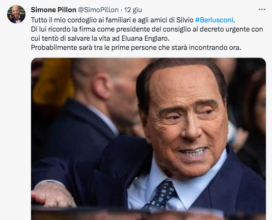 “Tutto il mio cordoglio ai familiari e agli amici di Silvio Berlusconi. Di lui ricordo la firma come presidente del Consiglio al decreto urgente con cui tentò di salvare la vita ad Eluana Englaro. Probabilmente sarà tra le prime persone che starà incontrando ora”. Così l’ex senatore leghista Simone Pillon approfitta della morte del leader di Forza Italia per tornare sul caso Englaro.