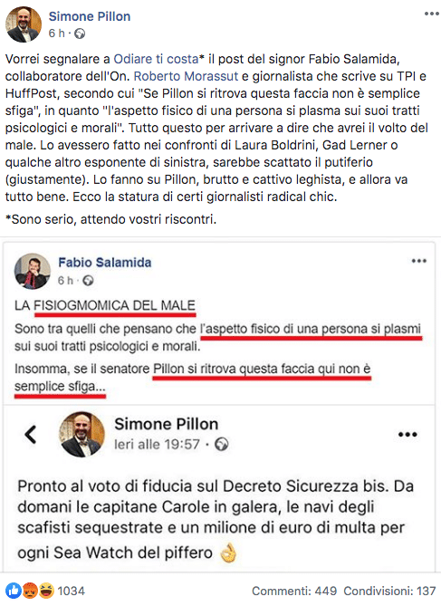 Il senatore Pillon oggi mi attacca per un post su Facebook in cui, facendo riferimento alla non empirica scienza della fisiognomica, scrivo che il suo aspetto fisico e la sua espressione ne rispecchiano idee e parole. Per farlo tira in ballo politici come Laura Boldrini e Roberto Morassut, il giornalista Gad Lerner e le testate dove pubblico i miei articoli, chiedendo a “Odiare ti costa” un riscontro su quanto ho scritto.