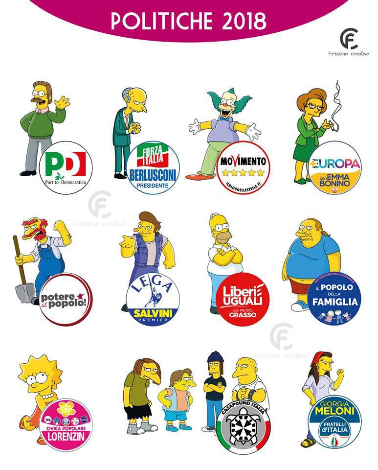 Uno di quelli che sta riscontrando un enorme successo è l’illustrazione dei personaggi dei Simpson come se fossero i leader dei principali partiti italiani.