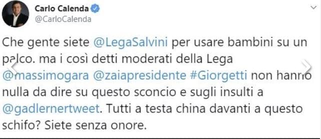 Tra le prese di posizione, spicca quella di Carlo Calenda. “Che gente siete voi della Lega per usare bambini su un palco? Ma i cosìddetti moderati della Lega”, dice l’europarlamentare rivolgendosi a Massimo Garavaglia, Luca Zaia e Giancarlo Giorgetti, “non hanno nulla da dire su questo sconcio e sugli insulti a Gad Lerner. Tutti a testa china davanti a questo schifo? Siete senza onore”.